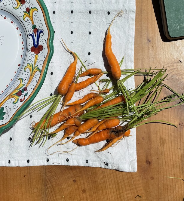 And I had a whole bunch of farmers’ market beets, oodles of tender carrots way too tiny to peel, and a wrinkly finger of garlic on the upstairs fridge door. There are grapes turning brown on the stem ends and a paper bag of Albemarle pippin apples (older than the Christmas citrus) all of which are wrinkled and half of which are rotten on one side or the other.