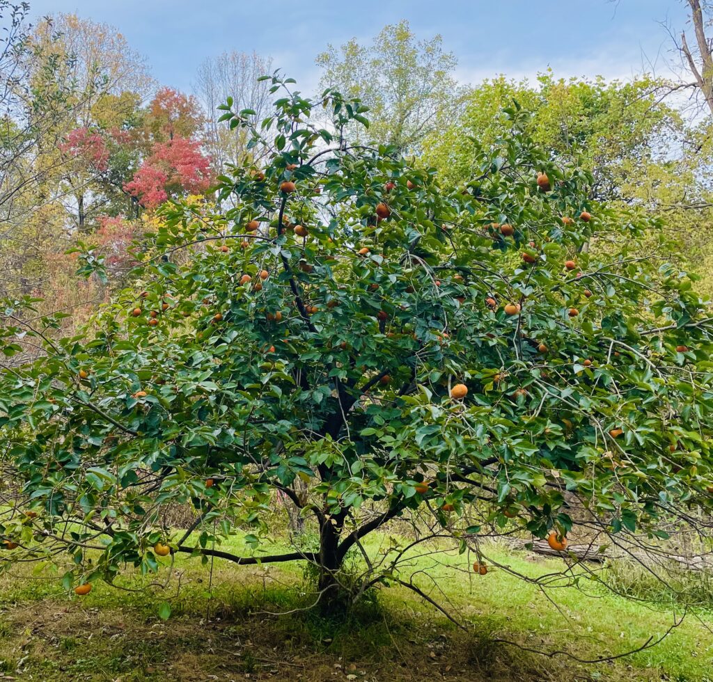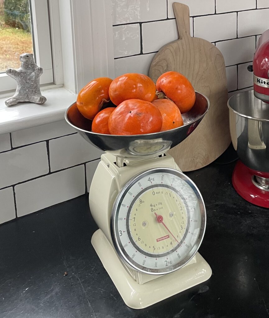 This was a whoo-hoo-hooray banner year for persimmons in our region, the piedmont of the Blue Ridge Mountains. I have no idea why, but we weren’t alone in finding far more persimmons ripening on the tree than in any year previous. The variety I’d planted some years ago are fuyu, the kind of persimmon that is delicious even before they get soft. So, we started eating them early. I’d peel and slice them to crunch fresh or julienne into slaw. Beginning when the fruit was barely blushing toward the orange-y orange they would become, I picked carefully in a kind of thinning of them. The braches are slender, and I wanted to relieve some of the weight the fruits were already putting on the wood. There were so many that at some point, we began to weigh our pickings.