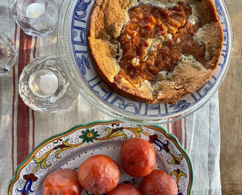Still, when I got home mid-December, the trees seemed to have the same number of fruits as they’d set in spring. I got some more into the dehydrator in slices and then in layers of pulp I rolled up to a chewy sweet leather. Finally, I was eating persimmons squishy-soft over the sink with a spoon. Glorious. But still. When it snowed, the fruit hung like ornaments. With about 200 pounds of fruit in our tally, I hated to think they rest would go to waste. Enter, the ever-adaptable coffee caked. Based on Marian Burros’s famous New York Times plum torte, I baked up sweet rounds to share. Here’s my persimmon riff on that recipe with a few other adaptations, to boot. As you can see, it’s also delicious with persimmons not quite so ripe, that still have a bite to the flesh.